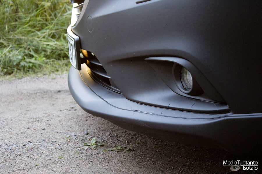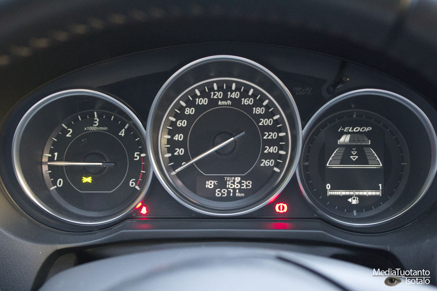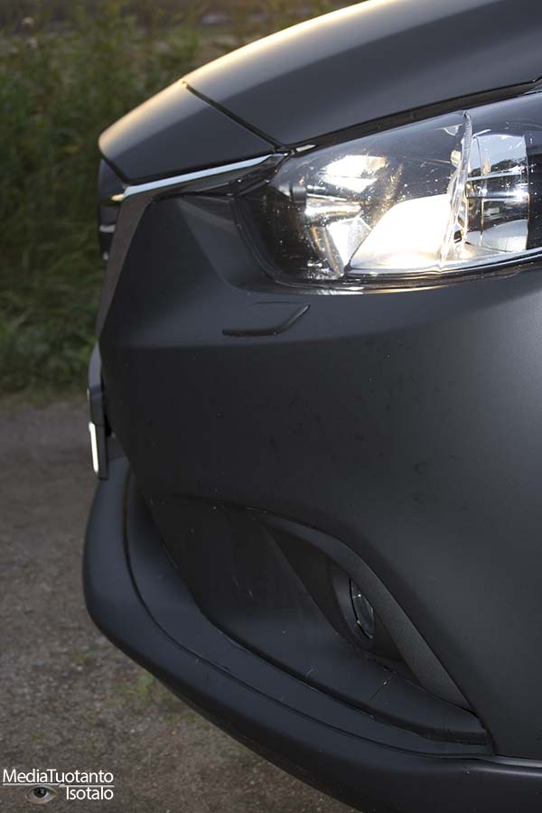 Mitä ovat nämä mystiset numerot, joita koeajo autoon oli teipattu kiinni? Sainko minä vahingossa kilpa-auton? Ei, en saanut kilpa-autoa vaan itse asiassa ekoauton. Miksi sitten ekoauto on maskeerattu sen näköiseksi kuin se söisi kuljettajan jos tämä yrittää varomattomasti lähetyä autoa? Mazda on päättänyt, että taloudellisen auton ei tarvitse olla laiska ja tehoton vaan sillä pitää olla silti hauska ajaa ja sen pitää miellyttää myös silmää.
