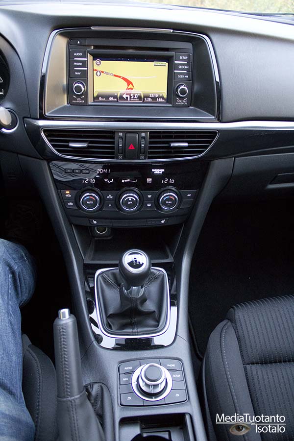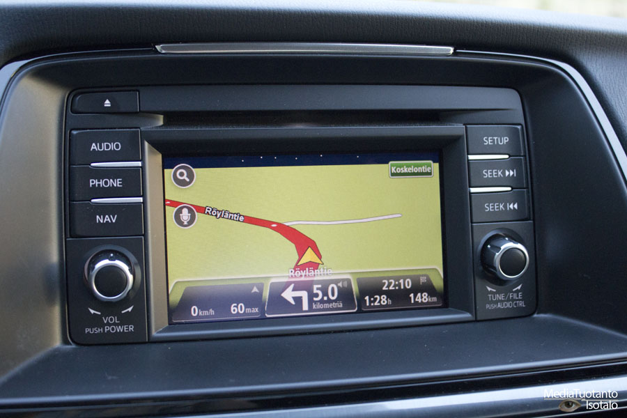 Vanhassa Mazdassa näyttö oli pikkuinen viiru keskikonsolin yläpuolella. Nyt sen tilalla on 5.8 tuuman kosketusnäyttö. Näyttöä voi ohjata siitä itsestään tai käyttämällä alempana olevaa pyöreää säädintä. Myös ratissa on säätimiä mutta niillä ohjataan mittaristosta löytyvää näyttöä.
