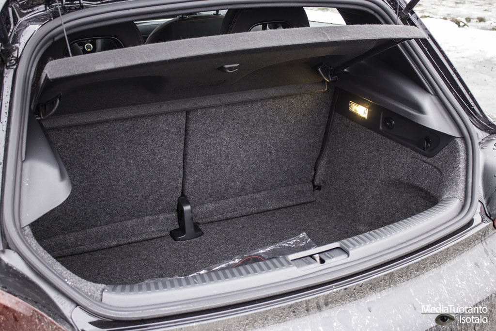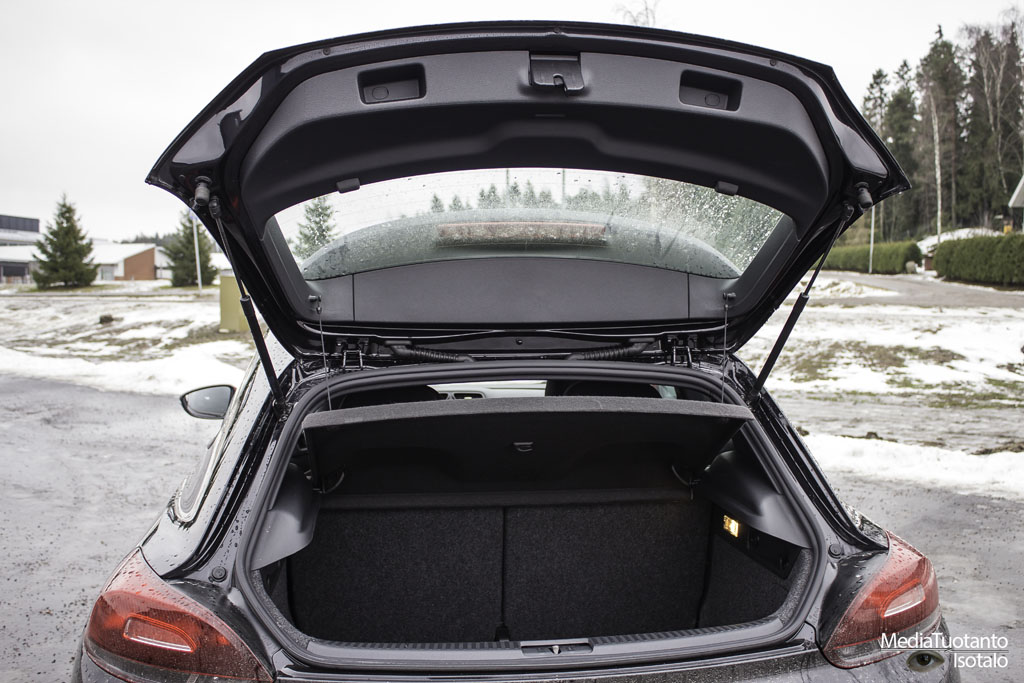 Tavaratila oli yllättävän hyvä urheilumaiseen autoon. Kaksi pientä matkalaukkua sujahti sisään ongelmitta ja kauppareissullakin voi olla huoletta, sillä ostoskasseja tavaratilaan menee oikeinkin hyvin ja ne pysyvät syvyydestä johtuen myös hyvin pystyssä.