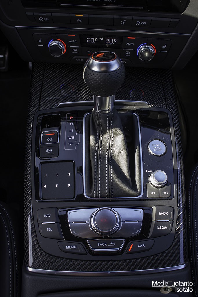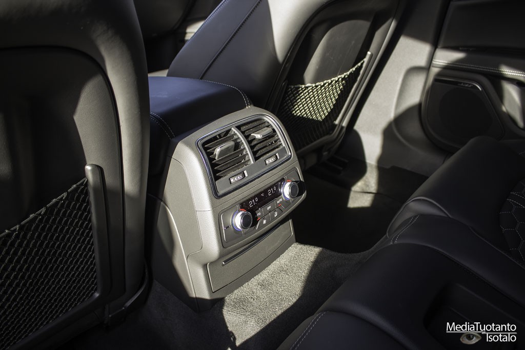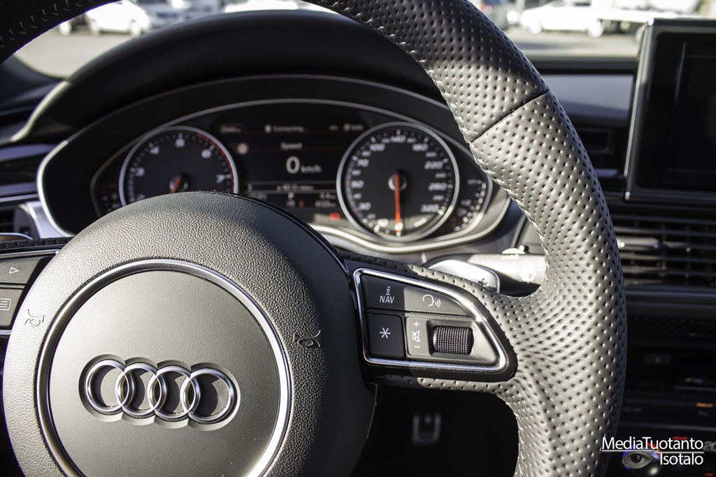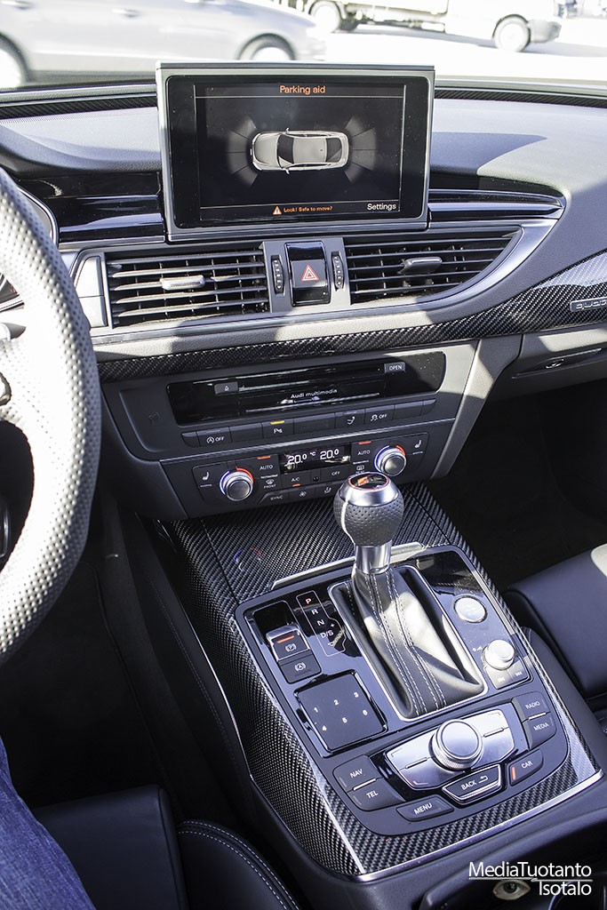 Sisätilat ovat RS7:ssa tyylikkäät ja mukavat. Tilaakin on oikein mukavasti neljälle henkilölle. Takapenkin keskelle ei pääse istumaan vaan siihen on sijoitettu säilytyslokero. Takapenkillä oli jalkatilaa runsaasti ja päätilaakin siinä tapauksessa jos ei kallista päätään ihan taakse. Auton profiili laskee taaksepäin, joten päätila pienenee sen myötä. Etupenkillä molempia penkkejä ohjataan sähköisesti ja niihin on myös muistipaikkoja, joilla omat asetukset saa kuskin vaihdon jälkeen välittömästi takaisin. Penkit ovat mukavaa nahkaa ja vaikka ne ovat kuppimaiset, eivät ne purista mistään. Tästä johtuen pitkäkin matka sujuu mukavasti. Sisään ja uloskäyntiä helpotetaan siten, että ratti nousee ylöspäin ja laskeutuu takaisin kun moottori käynnistetään. Kojetaulu on selkeä ja näyttö on 7″. Näyttö vetäytyy kojetaulun sisään kun moottori sammutetaan ja ovi avataan.