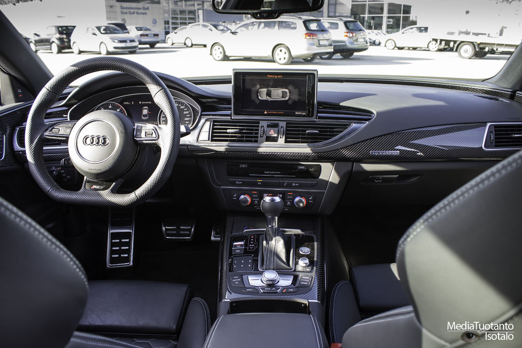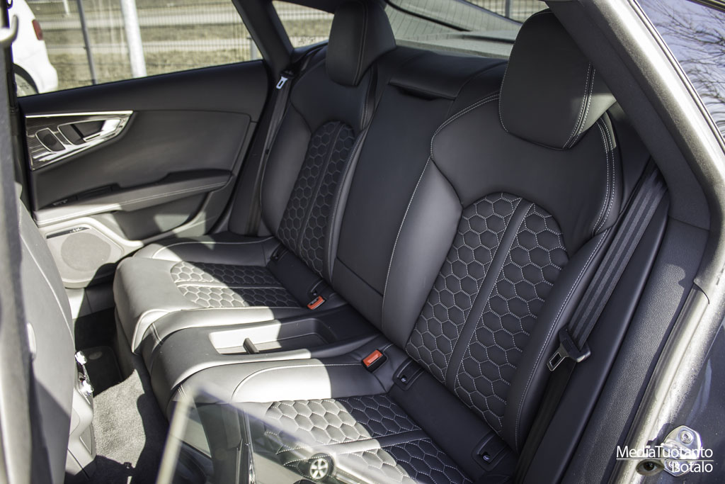 Sisätilat ovat RS7:ssa tyylikkäät ja mukavat. Tilaakin on oikein mukavasti neljälle henkilölle. Takapenkin keskelle ei pääse istumaan vaan siihen on sijoitettu säilytyslokero. Takapenkillä oli jalkatilaa runsaasti ja päätilaakin siinä tapauksessa jos ei kallista päätään ihan taakse. Auton profiili laskee taaksepäin, joten päätila pienenee sen myötä. Etupenkillä molempia penkkejä ohjataan sähköisesti ja niihin on myös muistipaikkoja, joilla omat asetukset saa kuskin vaihdon jälkeen välittömästi takaisin. Penkit ovat mukavaa nahkaa ja vaikka ne ovat kuppimaiset, eivät ne purista mistään. Tästä johtuen pitkäkin matka sujuu mukavasti. Sisään ja uloskäyntiä helpotetaan siten, että ratti nousee ylöspäin ja laskeutuu takaisin kun moottori käynnistetään. Kojetaulu on selkeä ja näyttö on 7″. Näyttö vetäytyy kojetaulun sisään kun moottori sammutetaan ja ovi avataan.