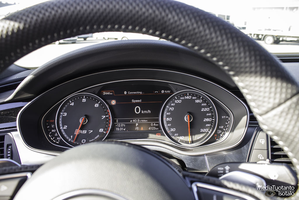 Tässä 560 hevosvoimaisessa ruutitynnyrissä on vääntöä 700 Nm ja se kiihtyy 0-100 km/h 3,9 sekunnissa. Tuo on jo pelkkiä numeroita tuijottamalla tavalliselle kadun tallaajalle jotain täysin käsittämätöntä. Arvatkaas vaan miltä se sitten tuntuu ratin takana. RS7 lähtee liikkeelle sellaisella intensiteetillä, että ensin se tuntuu potkaisulta ristiselkään ja sen jällkeen suoliston uudelleenjärjestelyltä. Pään sisällä veri siirtyy sujuvasti otsalta lähemmäs takaraivoa. Siltikin auto tarrautuu asfalttiin purukumin lailla ja se on täysin hallinnassa.