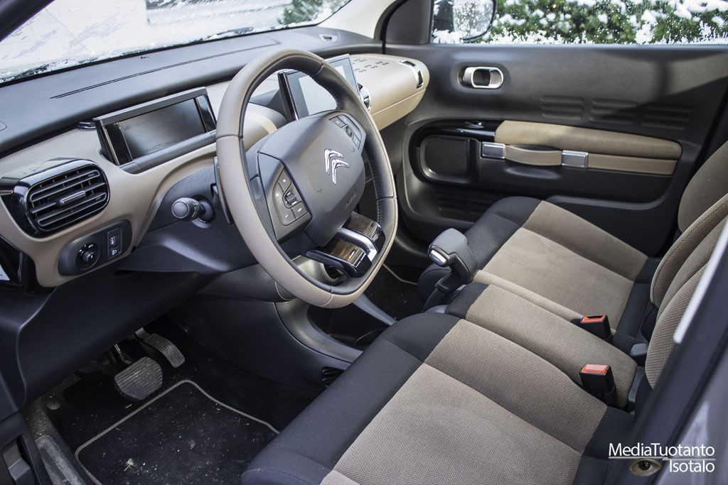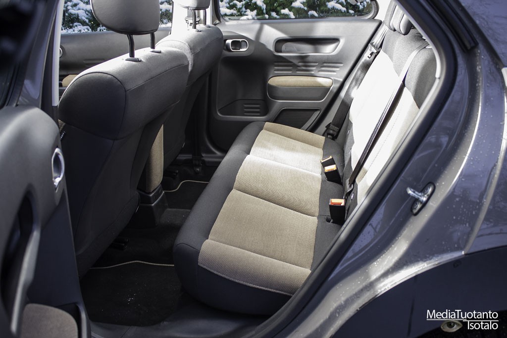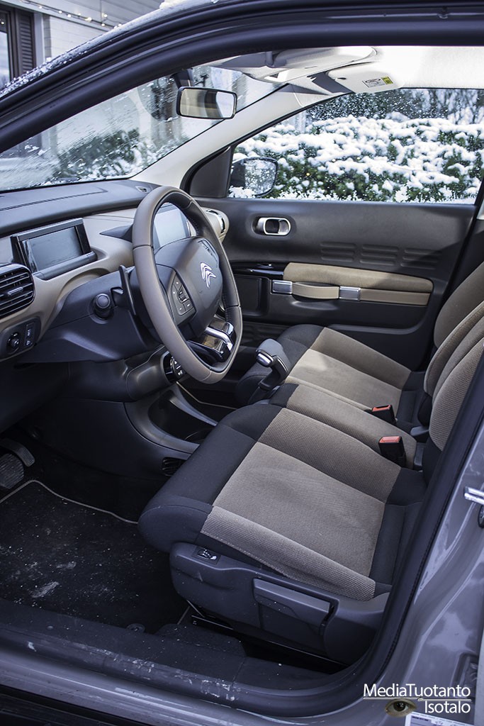 Sitten päästään penkkeihin. Cactuksen seuraava erikoisuus on sohvamaiset ja pehmeät penkit. Sohvamaisilla tarkoitan juuri sellaista pehmeää kangassohvaa, johon takapuoli uppoaa kunnolla. Tässä on samanlainen tunne. Lisäksi etupenkki on leveä ja jos keskellä olisi turvavyöpaikka niin siinäkin voisi joku lapsi istua. Takapuoli ei kyllä puudu tässä penkissä mutta itselläni oli hieman vaikeuksia löytää täydellistä asentoa reisien kannalta.