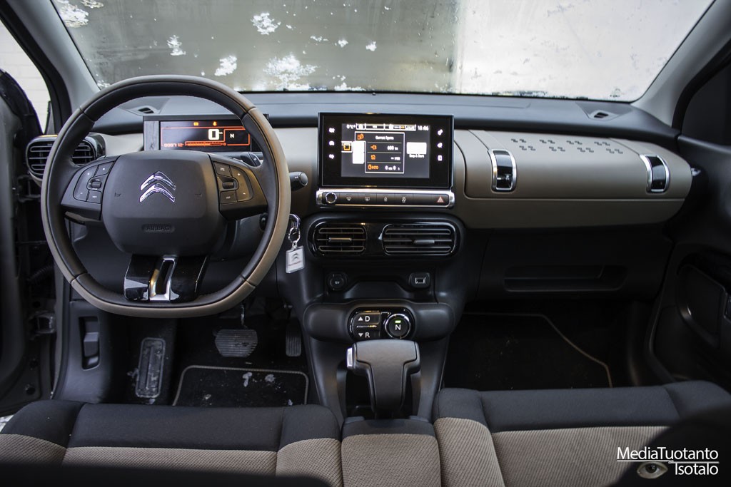 Mittaristo kuljettajan edessä on digitaalinen, pitkulainen näyttötaulu. Siinä ilmoitetaan nopeus ja sen hetkinen vaihde numerona. Polttoaineen määrä ilmaistaan alareunassa olevalla palkilla. Kaiken kaikkiaan aika minimalistinen. Lisää informaatiota ja suurin osa säädöistä löytyy keskikonsolissa olevasta 7″ näytöstä. Näyttöön on puskettu aika paljon tavaraa ja jopa lämpötilan säätäminen tehdään koskettamalla siellä + tai – painikkeita tai raahamalla sormella palkkia kylmään tai lämpimään päin. Täytyy sanoa, että tuo säätäminen haittaa melko lailla ajamiseen keskittymistä. Näytössä on myös Media/Radio/Navi yms. normaalit toiminnot. Näytön alareunassa on rivi tavallisia nappeja ja niistä saa mm. ajovakautuksen pois sekä etu- ja takalasilämmityksen päälle. Reunimmaisena tuossa nappirivistössä on hätävilkut ja jos yrittää kättä vakauttaakseen tukea rannetta näytön alareunaan, saattaa vahingossa kytkeä hätävilkut päälle. Testattu on keskellä Kehä3:sen iltapäiväruuhkaa kun yritti laittaa lämpöä pienemmälle.