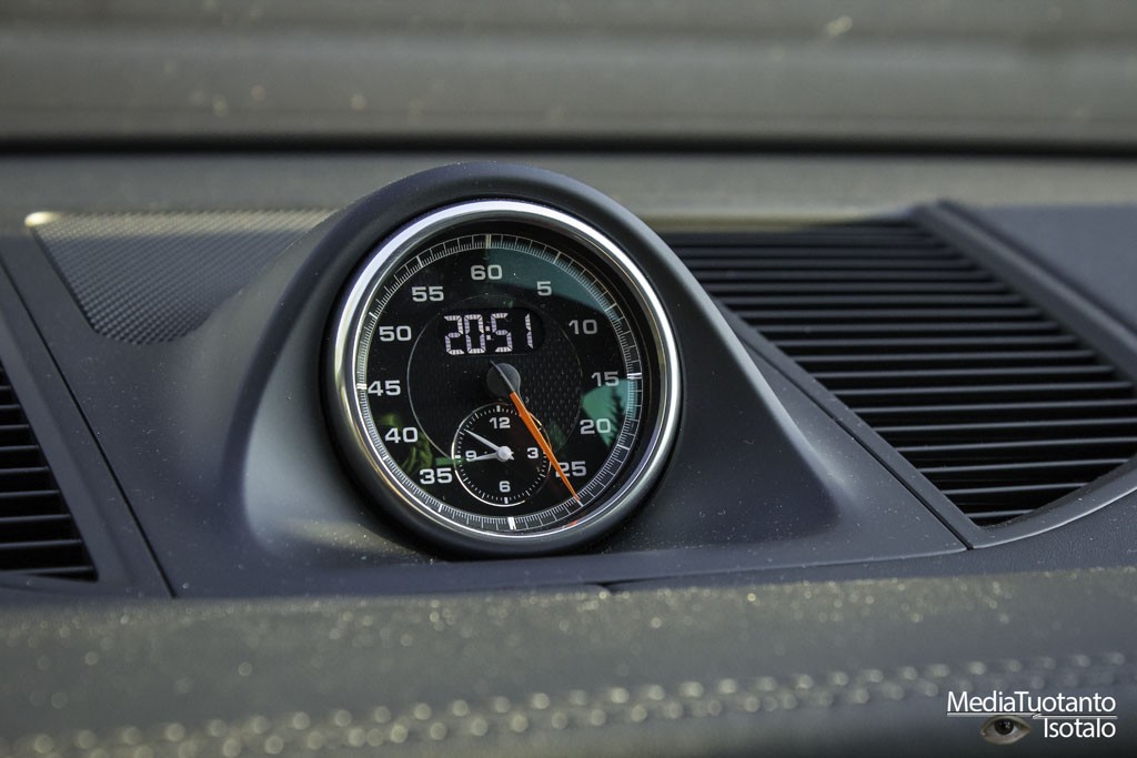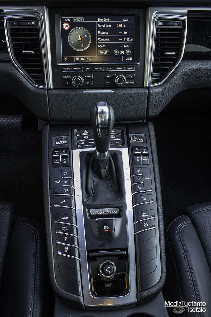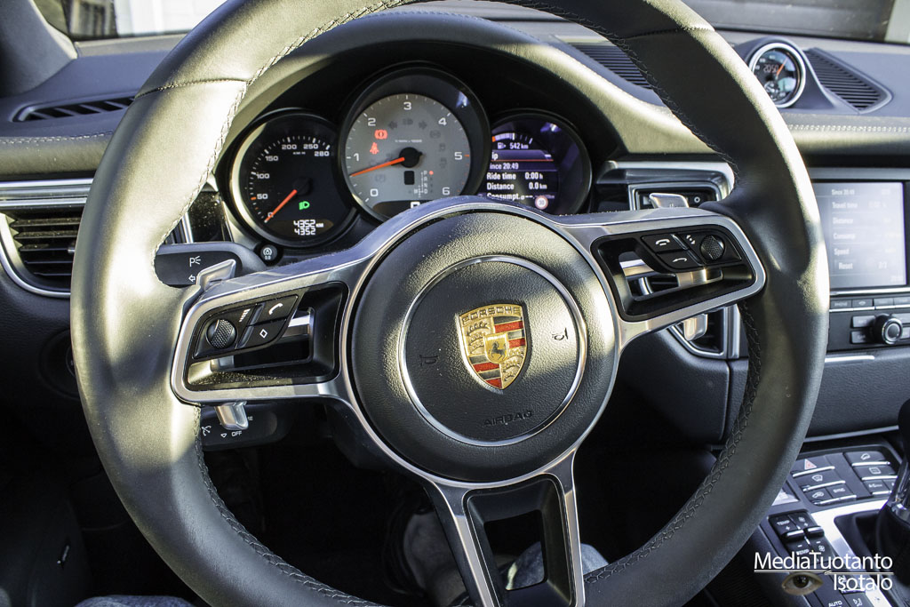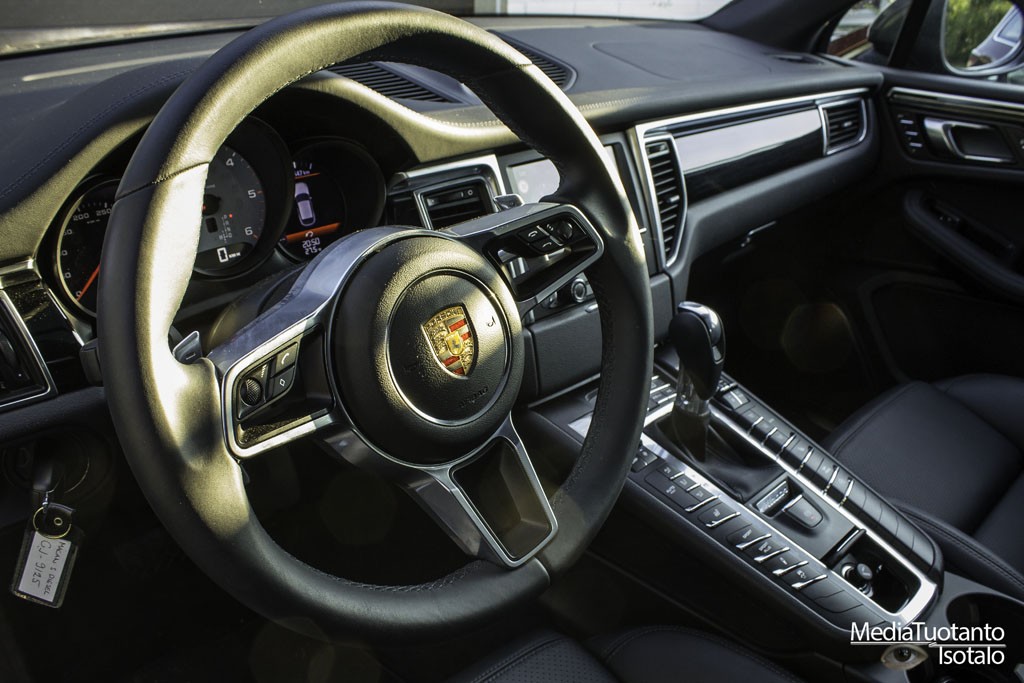 Porsche Macan S on sisätiloiltaan hieno. Nahkapenkit 18-suuntaan säätyvinä antavat varmasti hyvän ajoasennon. Mittaristo on selkeä ja keskikonsolista löytyy erillinen nappi joka toiminnolle. Bosen kaiuttimet vastaavat viihdepuolesta ja niitä onkin sijoiteltu autoon hyvin monta.