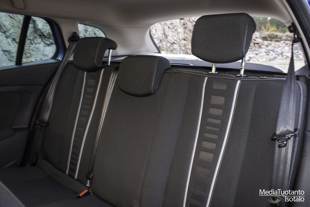 Penkit ovat pehmeät ja tukevat. Selän sivuttaistuki on jopa todella jämäkkä kun taas istuinosassa on hieman väljempää. Ratista on hyvä pitää kiinni sen muotoilun ja nahkapinnan johdosta. Nappeja on tässäkin vain kaksi. Takapenkillä mahtuu aikuinenkin istumaan mukavasti ja hillitty muotoilu antaa mahdollisuuden myös keskellä istumiseen. Lasten turvakaukalo mahtui ilman tunkemista takapenkin kaikkiin paikkoihin ja turvavyön pituus riitti kaukalon ympäri.