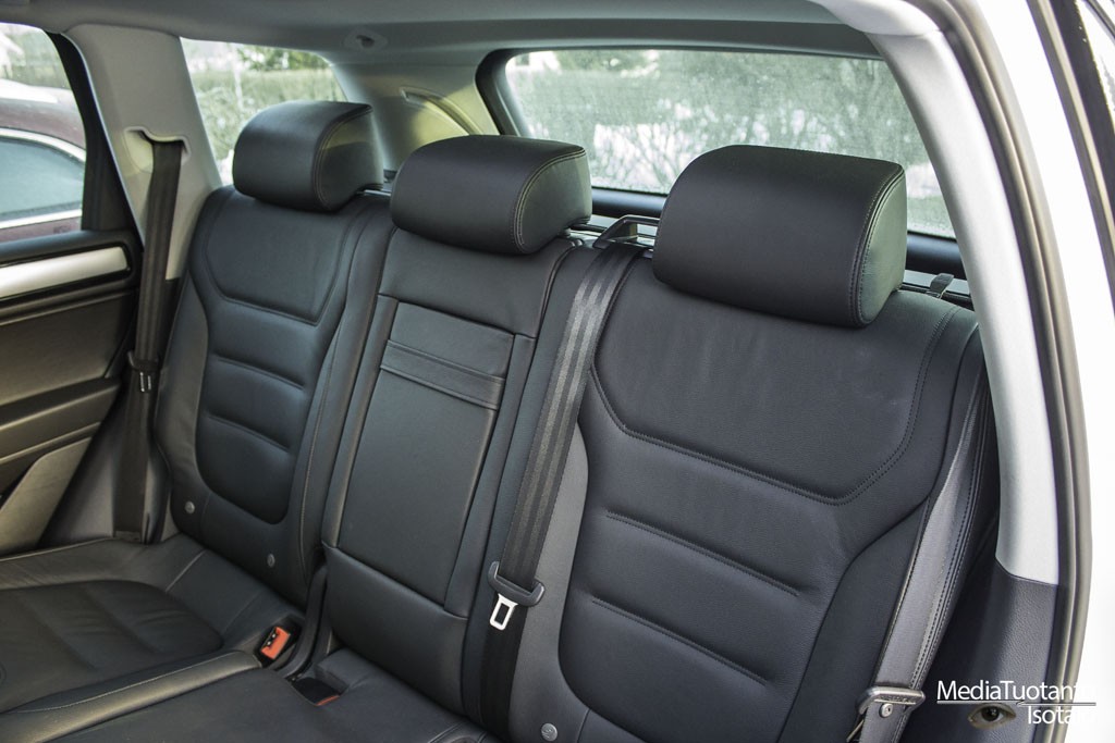 Sisätilat Touaregissa ovat luxus-luokkaa. Koeajoyksilö oli R-line varusteltu eli siinä oli hieman normaalia laadukkaammat sisätilat ja ulkopuoleltakin auto oli hieman näyttävämmän näköinen. Penkit olivat nahkaiset ja penkinlämmittimet lämmittivät ne tehokkaasti kylminä aamuina. Penkeissä oli sähköiset säädöt ja mahdollisuuksia olikin niin paljon, että täydellisen asennon löytyminen olisi vaatinut pidemmän ajan kuin neljä päivää. Kun sopiva asento löytyy, sen voi laittaa muistiin. Muistipaikkoja on kolme, jotka yleensä varmaan riittävät kaikille sitä autoa kuljettaville.