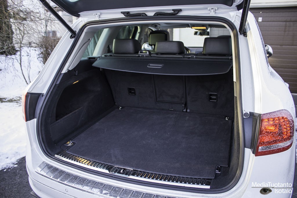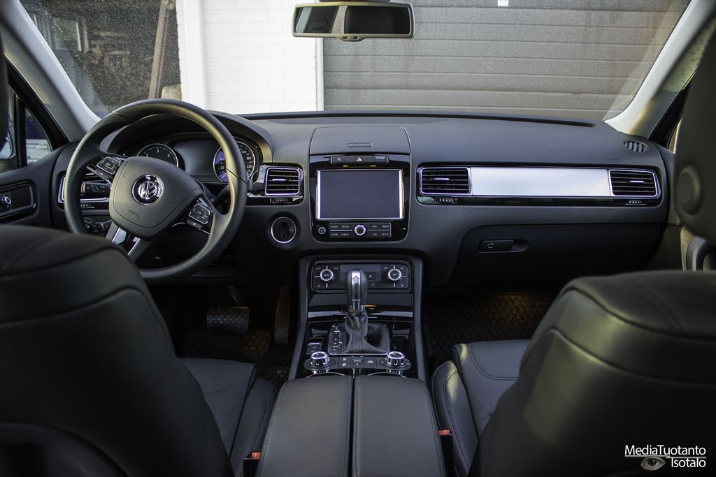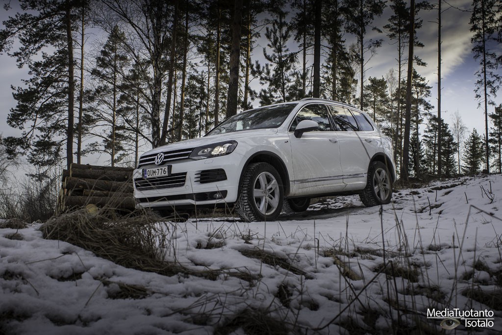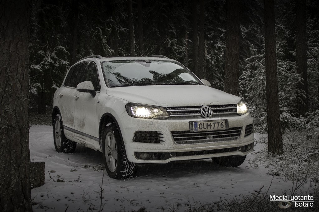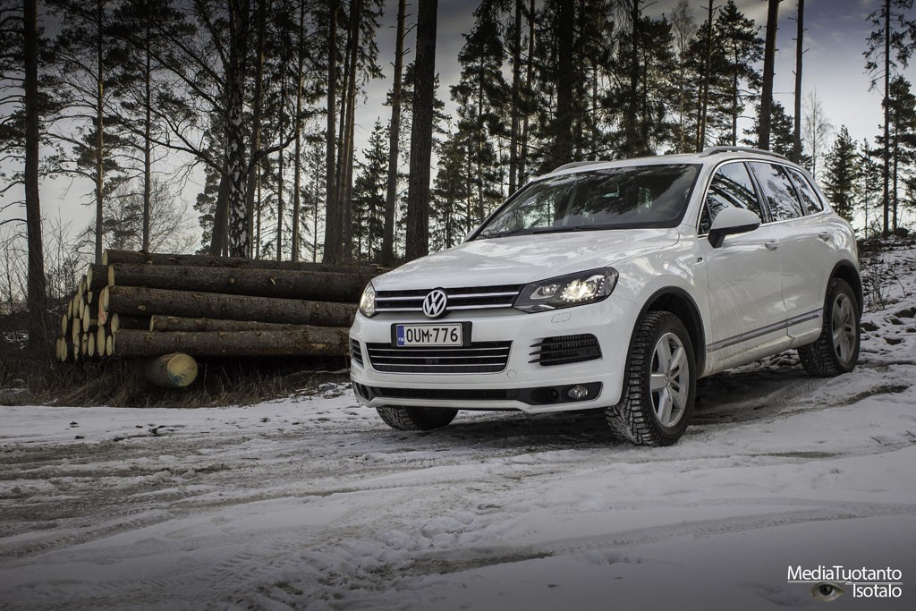 Olin ennen Touaregia ajellut viikon verran hieman tehokkaammalla Audin maasturilla, joten ensimmäinen reaktio liikkeelle lähdettäessä olikin, ettei auto kulje mihinkään. Vaikka molemmissa autoissa on 3.0 litrainen TDI moottori, on väännössä ja hevosvoimissa toki paljonkin eroa. Siltikin, Touaregilla ei todellakaan jää liikenteessä jalkoihin, siinä kaasua pitää vaan käyttää hieman etuvarvasta enemmän. Touaregista on toki olemassa myös V10-moottorilla varustettu malli mutta se ei ole Suomen valikoimissa. Koeajoauto oli 180kW V6 moottorilla varustettu ja auton painaessa hieman yli 2200 kg, on enemmän ehkä merkitystä 550 Nm väännöllä.