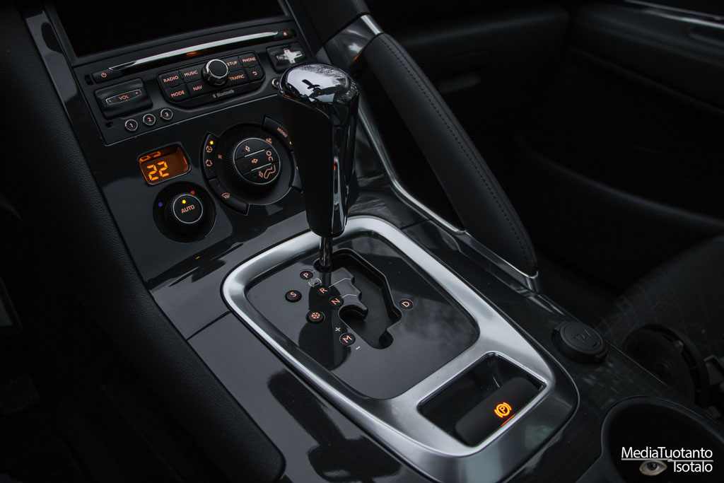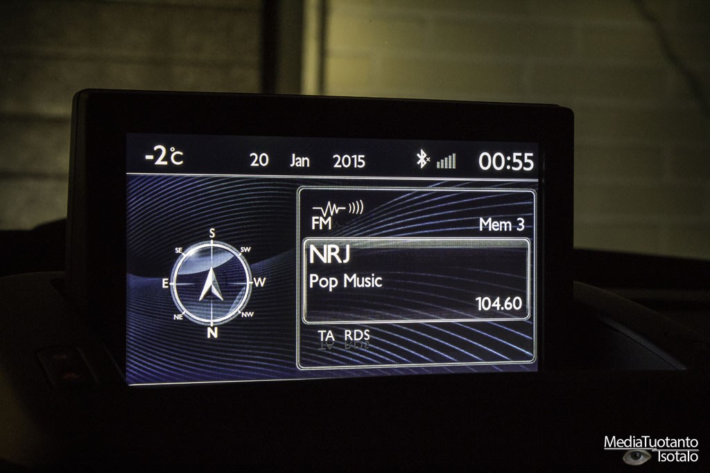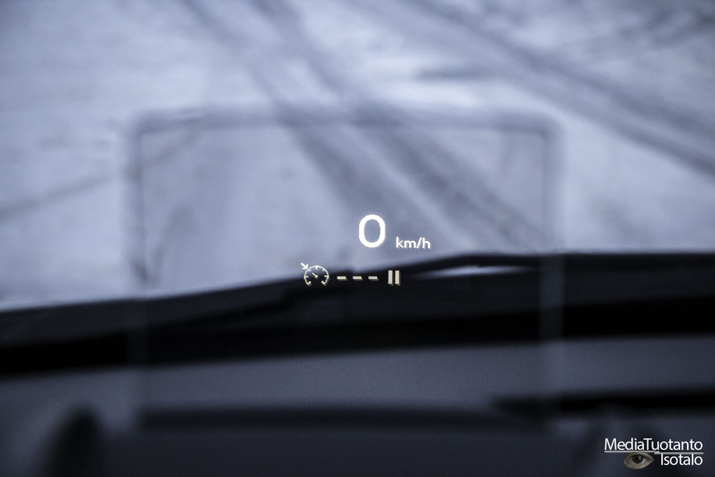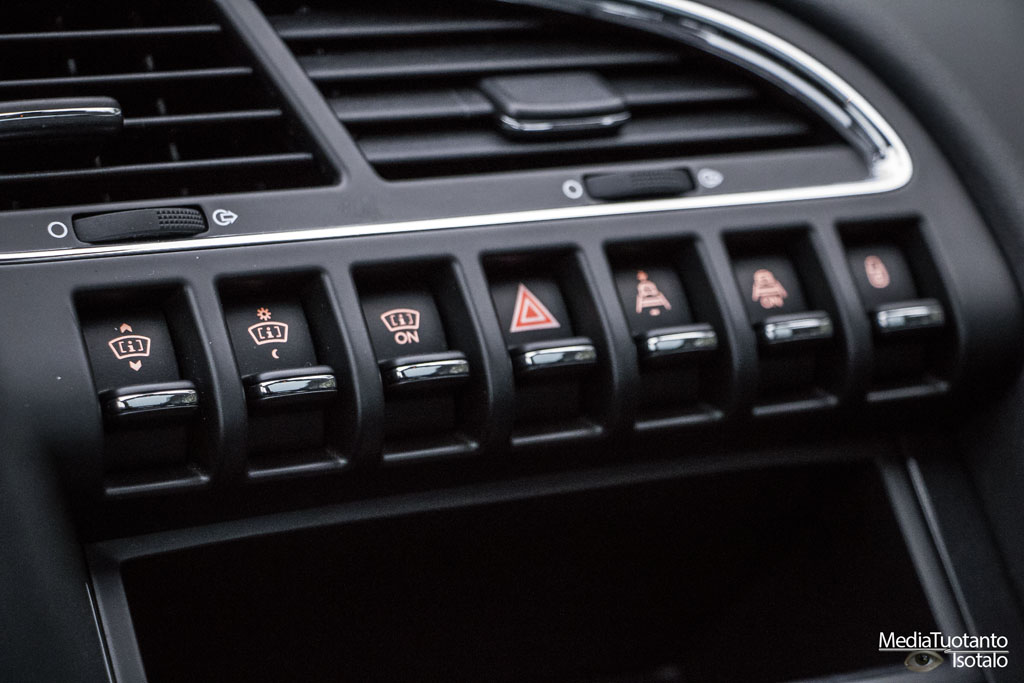 Nappuloita keskikonsolissa on aika paljon. Osa niistä liittyy kuljettajan eteen nousevaan HUD -näyttöön, joka näyttää hieman hävittäjien vastaavilta. Tähtäintä tässä ei ole mutta esim. sen hetkisen nopeuden saa näkymään. Nappirivistössä on myös etäisyysanturiin liittyviä säätimiä. Auto varoittaa jos ajetaan liian lähellä edellä olevaa. Navigaattori on yksinkertainen, se ei näytä mitään karttaa vaan pelkästään tien kuvan ja nuolia. Pissapoika näytti automaattisesti sumuttavan 3 kertaa.