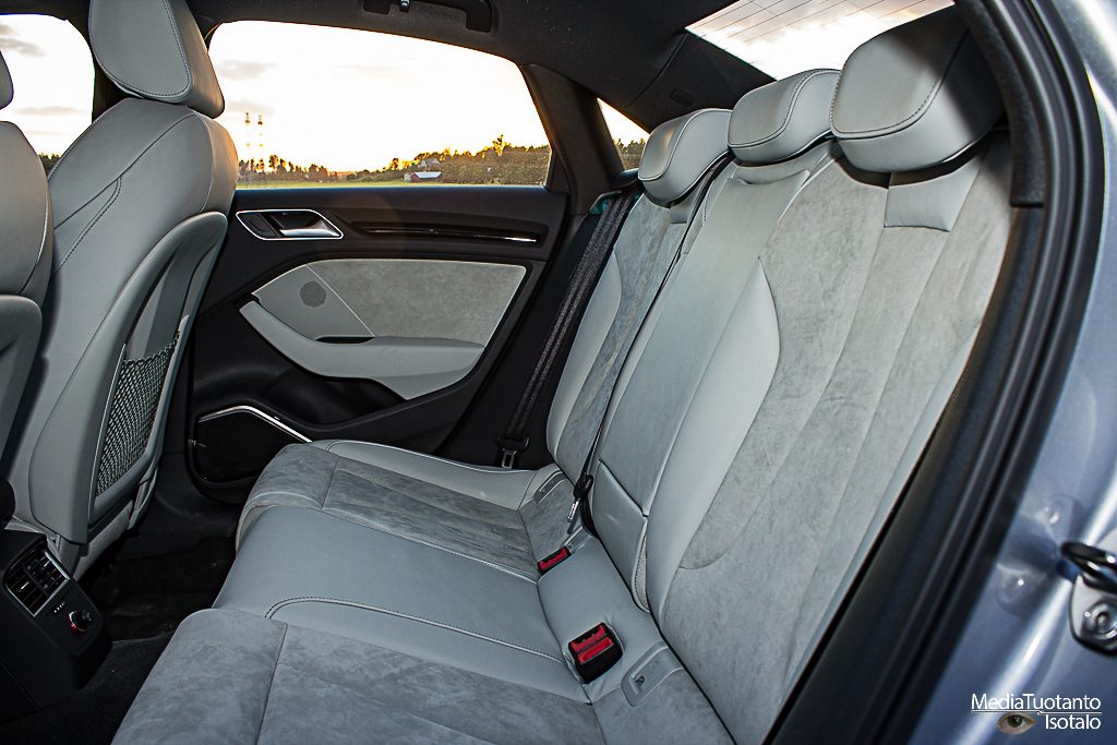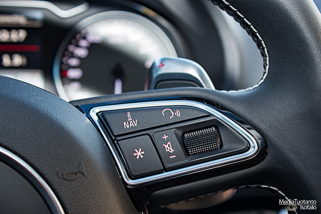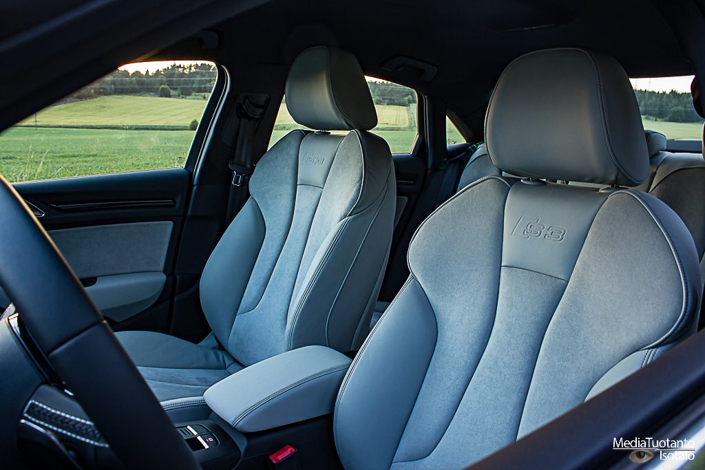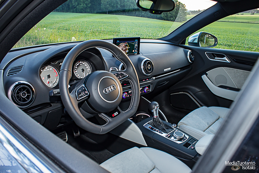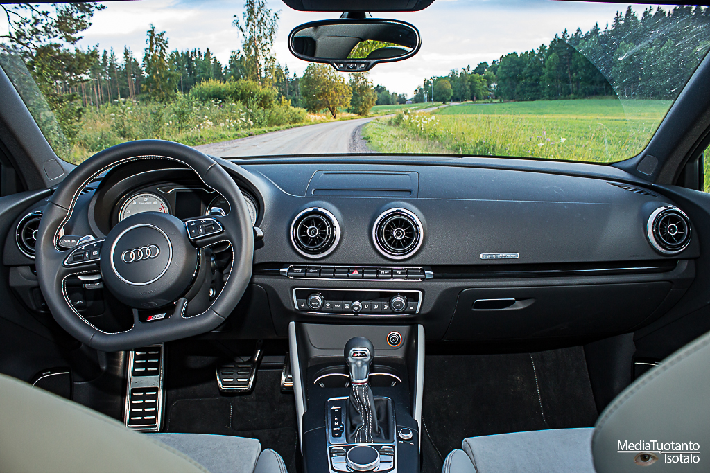 Sisällä hallintalaitteet ja kojetaulu on tuttua Audia, säätimet ovat selkeitä ja niitä on helppo käyttää. Penkit ovat urheilumaiset eli ne tukevat joka puolelta hieman normaalia enemmän. Vaalea nahkapinta penkeissä ja muutenkin vaalea verhoilu tuo valoisan tunnelman sisätiloihin. Tällä värillä on tietysti omat hankaluutensa kurakeleissä tai pienten lapsien suhteen. Taakse mahtuu aikuinenkin istumaan mukavasti mutta lastenistuinta emme tällä kertaa päässeet testaamaan.