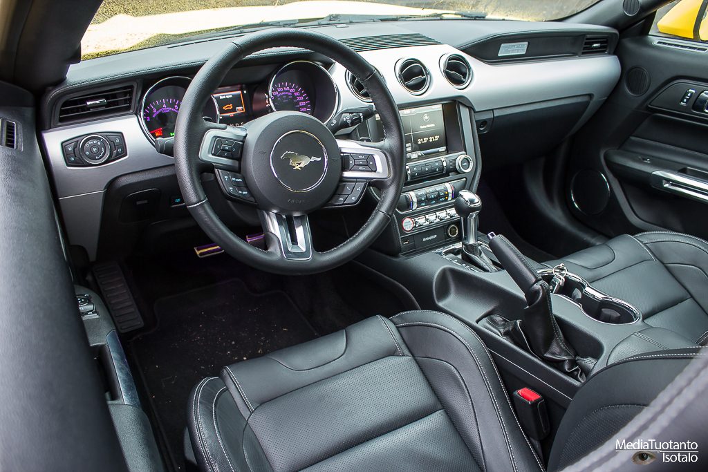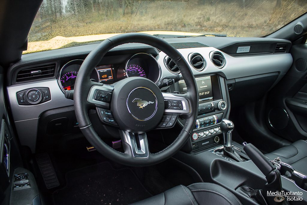 No mutta miltäs se ajaminen sitten tuntuu? Suoraan sanottuna ensimmäiset päivät piti ajella kieli keskellä suuta. Normaali ajomoodissa auto oli suhteellisen rauhallinen mutta siirrettäessä Sport+ (tai Track) asetukselle, pääsi poni irti. Auton paino on etupäässä ja takapyörät taas ovat ne vetävät. Jotenkin tuntui, kun Mustangin etu- ja takapää olisivat eläneet ihan erillistä elämäänsä. Muut kanssa-autoilijat todennäköisesti pitävät kuljettajaa välillä leventelevänä tai kerskailevana johtuen ihan siitä, että auto tarjoaa takapäätä sivulle todella herkästi. Lapasesta se ei lähde mutta ajonvakautusjärjestelmä on ehkä hieman hitaan puoleinen reagoimaan tai sitten se on tarkoituksella tehty antamaan tietyn verran tilaa kuljettajan leikittelylle.