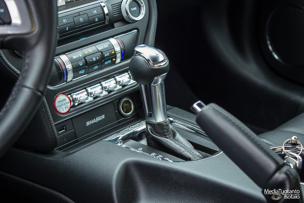 Keskikonsolissa sijaitseva näyttö on standardi Fordia, jollainen löytyy mm. Mondeo ja Focus – malleistakin. Mittaristo on omanlaisensa ja siellä on hauskasti ilmaistu nopeus termillä ”ground speed”. Vaihteenvalitsimen päässä on pyöreä nuppi ja sen päällä nappi. Nappia pitää painaa, kun haluaa siirtää vaihdevipua johonkin suuntaan. Näytön alapuolella on rivi kunnon vipuja, joilla säädetään erilaisia asioita, kuten ajotilaa.