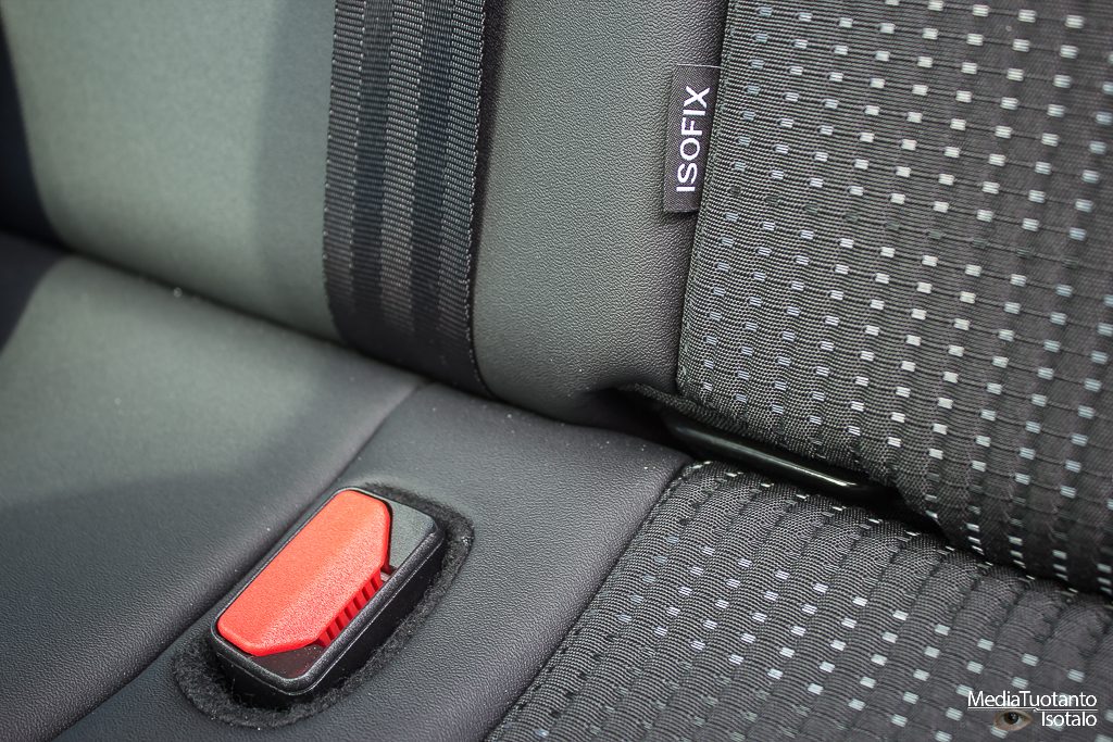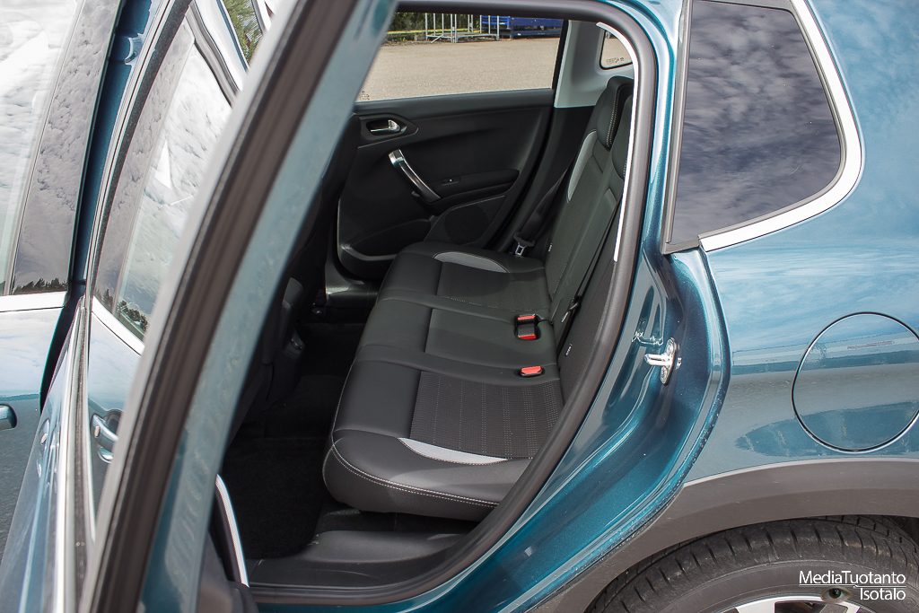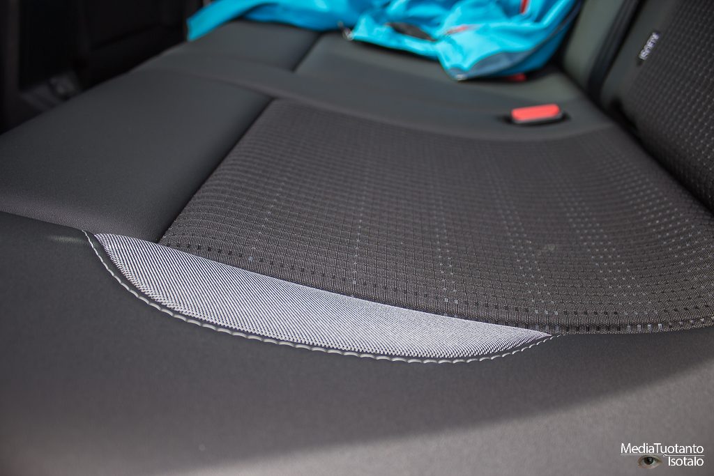 Takapenkille mahtuu aikuinenkin hyvin istumaan. Korkealla oleva katto tekee sen, että 180cm:n ihmisellä hiukset saattavat hieman ottaa kattoon kiinni mutta ei pää. Penkit ovat napakoita eikä niissä ole sivuttaistukea.