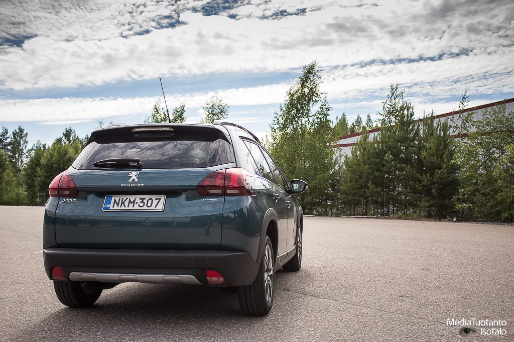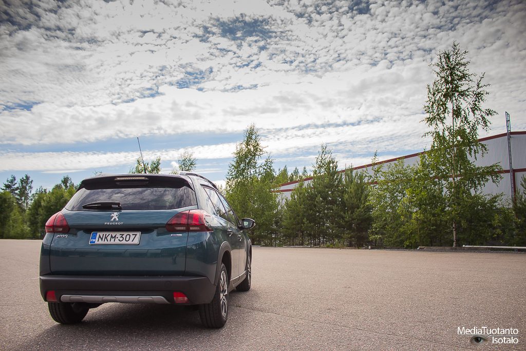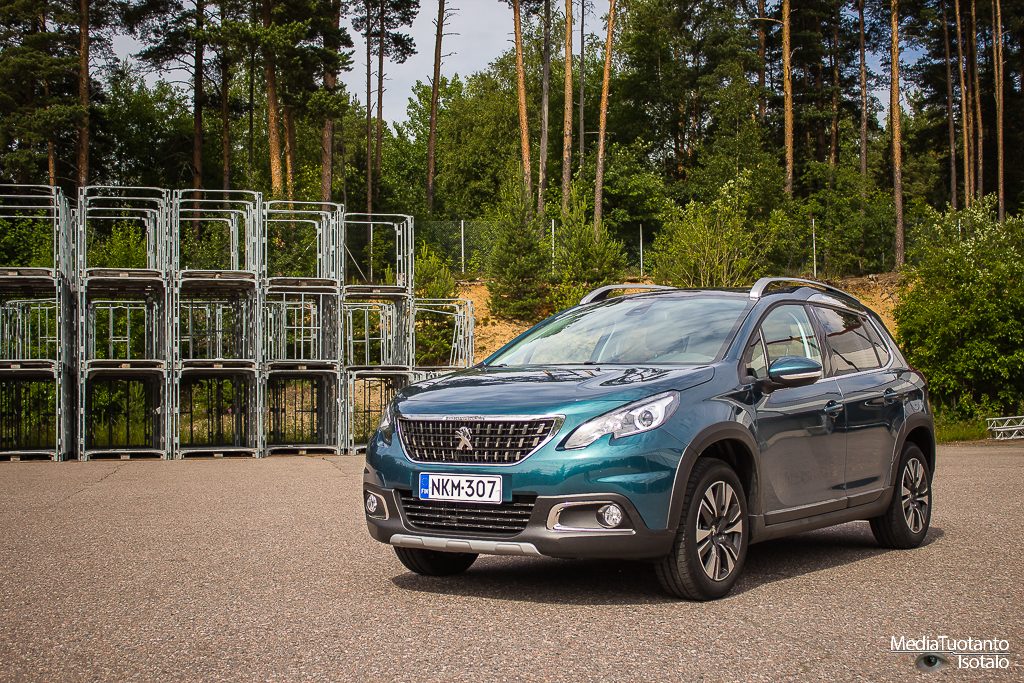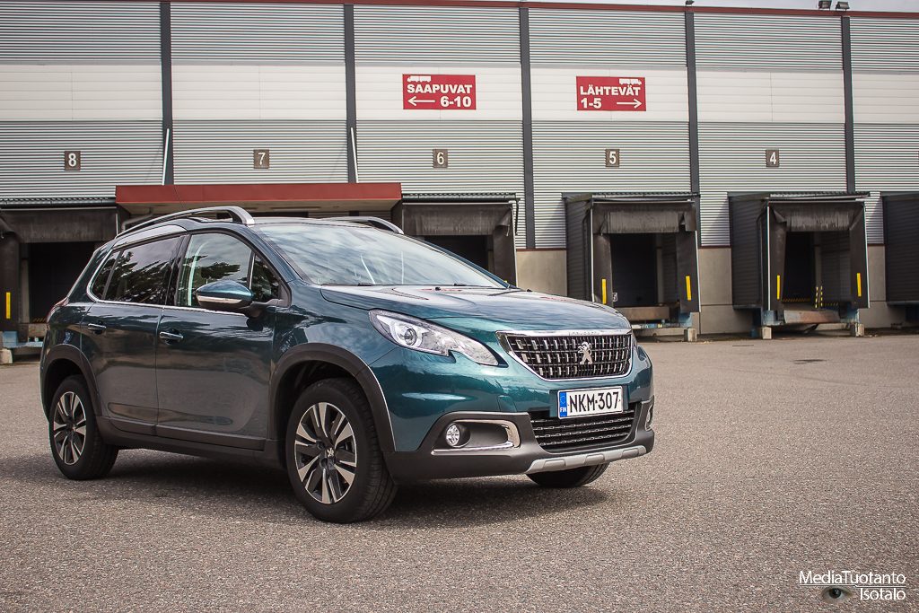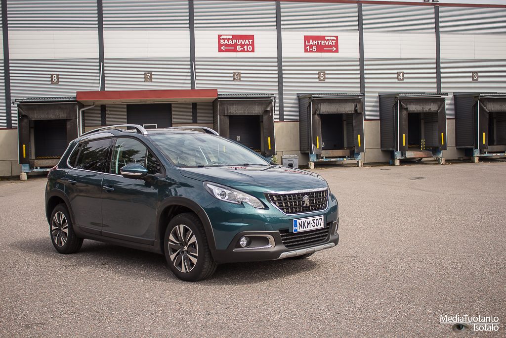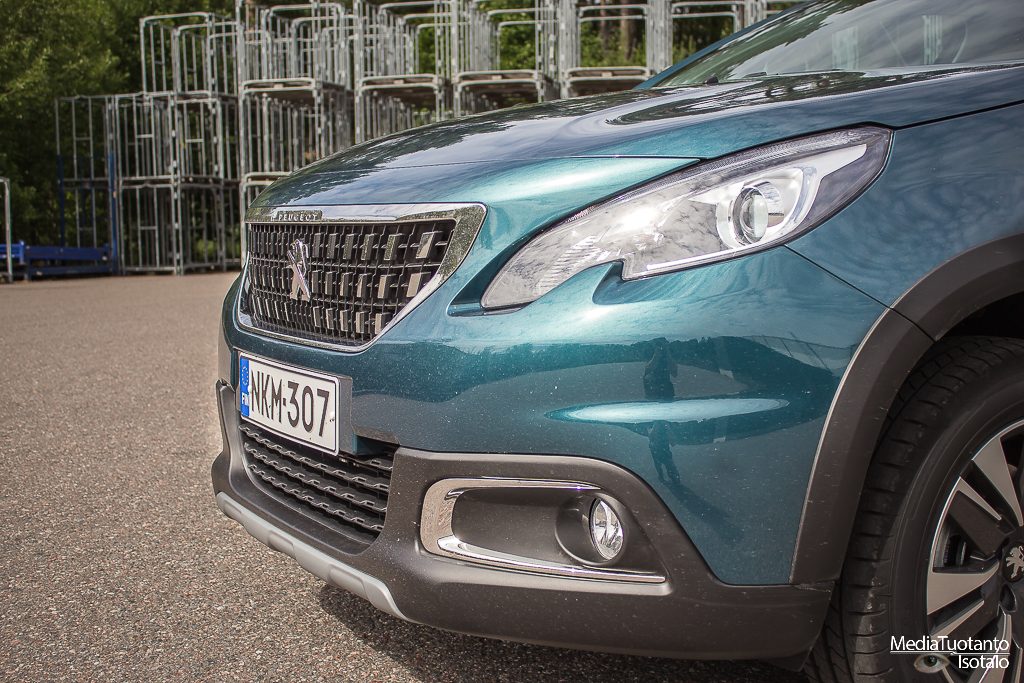 Peugeot merkitsee korotetut mallinsa tuhatlukemilla eli 208 mallin korotettu versio on Peugeot 2008. Lähestyttäessä autoa ensimmäiseksi silmiin osuu todella korkea ja tylppä keula. Tässä ei kuitenkaan ole jäädytinritilässä raapaisujälkeä kuten isommissa malleissa oli mutta muhkea se on silti. Korotettuna kaikki näyttää suuremmalta. Emeraldin vihreä väri kiiltelee auringossa ja auto kutsuu ajelulle.